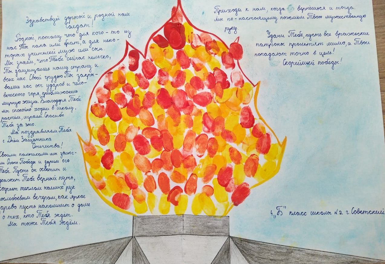 Нотариусы Югорска и Советского района в преддверии 23 февраля провели две благотворительные акции. Помощник нотариуса, заместитель председателя Совета молодежи Нотариальной палаты ХМАО-Югры Вера Леонова в школе №2 провела акцию "СВОими руками согреем теплом", в рамках которой учащиеся 4 класса подготовили поздравительные открытки бойцам. Ребята отпечатками своих пальчиков зажгли Огонь Победы и написали трогательные пожелания бойцам. Эти открытки будут отправлены на фронт совместно с посылкой солдатам, подготовленной нотариусами Гульнарой Ушацкой, Еленой Кемеж, Оксаной Петровой и Ириной Севастьяновой.