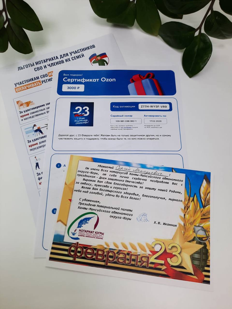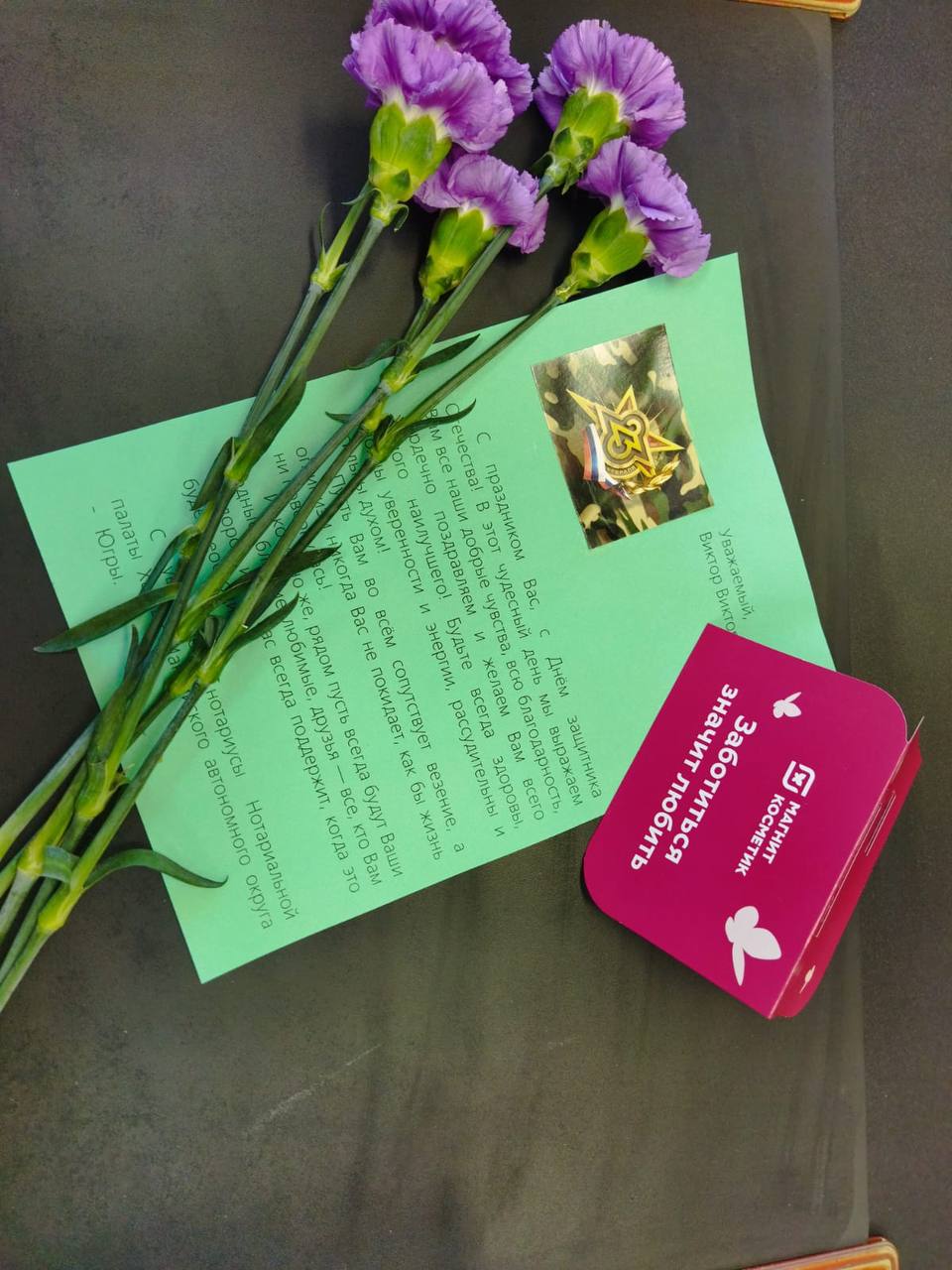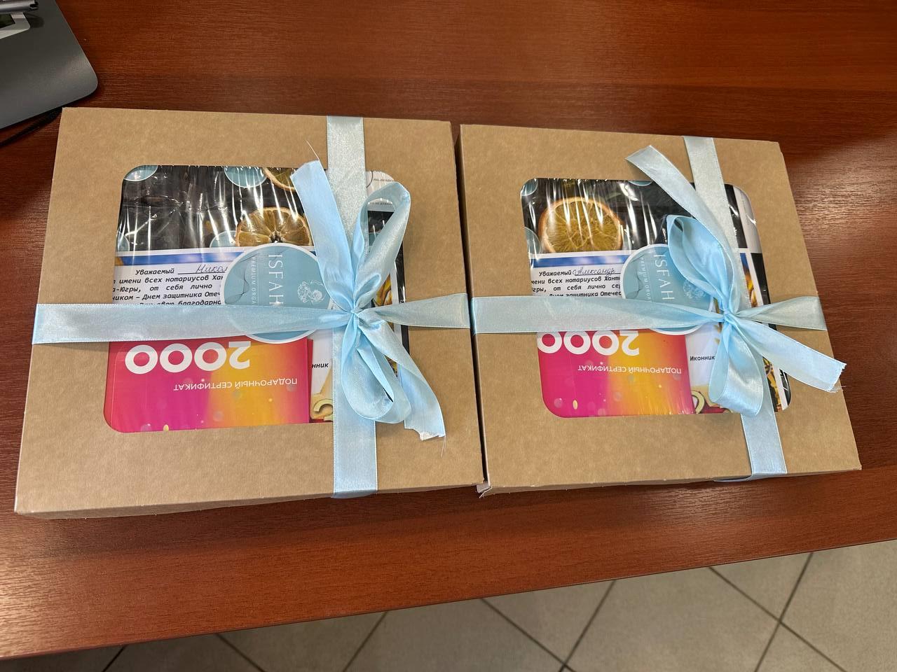 В Ханты-Мансийске ветеранов СВО с Днем защитника Отечества поздравила от имени всех нотариусов округа и вручила им подарки от Нотариальной палаты ХМАО-Югры нотариус Лидия Вахрушева, в Ханты-Мансийском районе - нотариус Горноправдинска Ангелина Овсянникова, в Сургуте - нотариус Татьяна Белина и помощник нотариуса Екатерина Белина, в Сургутском районе – помощник нотариуса Солнечного Галина Вандер, в Лянторе – помощник нотариуса Денис Мунтян, в Нижнесортымском - нотариус Анна Кучеренко, в Нижневартовске - помощник нотариуса Лилия Поветкина и сотрудники нотариальной конторы, в Нижневартовском районе – нотариус Светлана Матвеева, в Нефтеюганске и Нефтеюганском районе – нотариус Анастасия Грищенко, в Пыть-Яхе – помощник нотариуса Нона Хачатрян, в Мегионе - нотариусы Вера Бобровская, Роман Войтюк и Галина Карпенко, в Нягани – Екатерина Шахбанова, в Лангепасе – нотариусы Эльмира Зарипова и Марика Романова, в Советском районе - помощник нотариуса Вера Леонова, в Урае – нотариус Ольга Ярцева, в Белоярском – нотариус Марина Бон, в Березовском районе – нотариус Игорь Ондар, в Октябрьском районе – нотариус Светлана Акашева, в Кондинском районе – нотариус Кермен Араева.