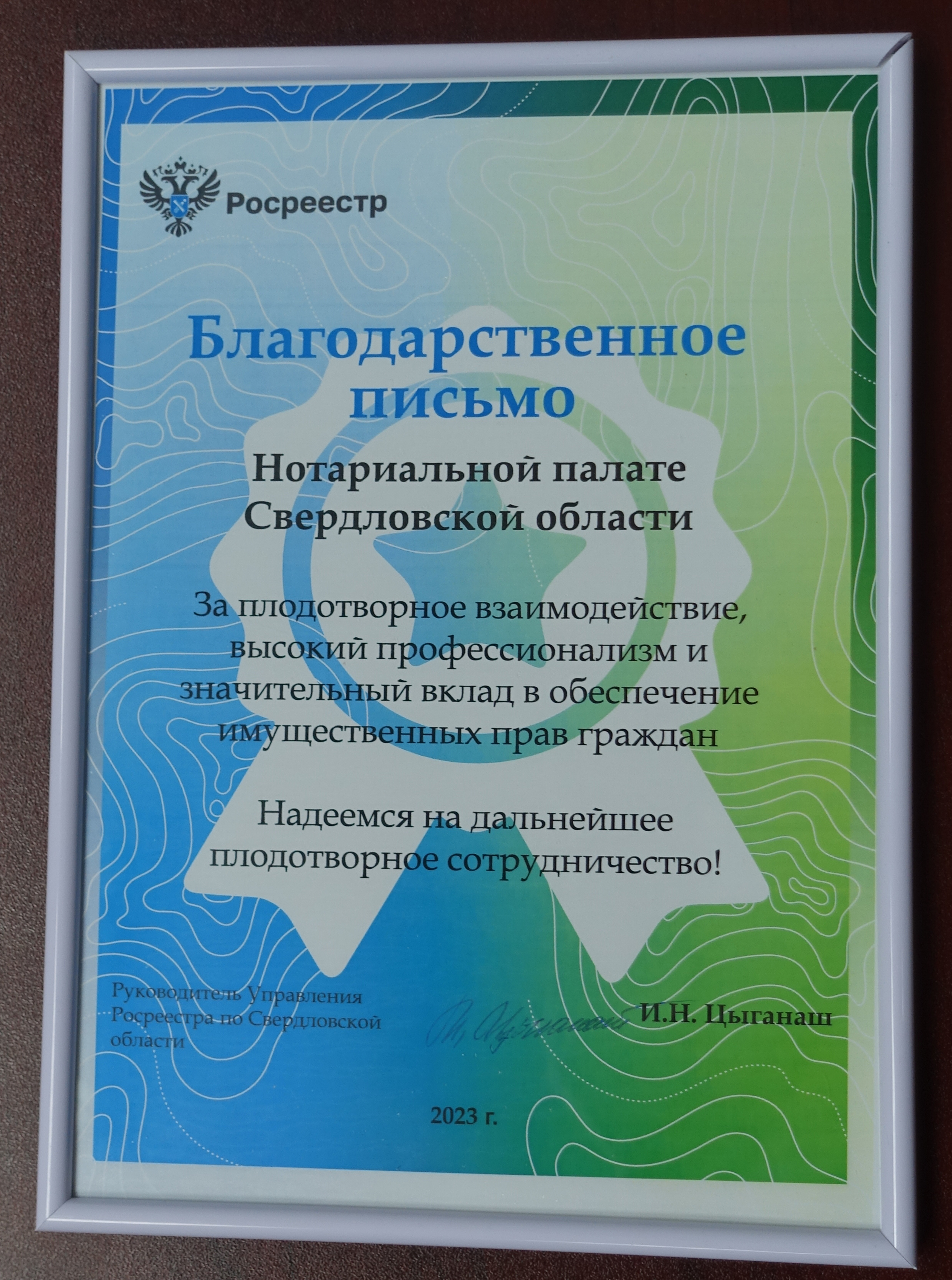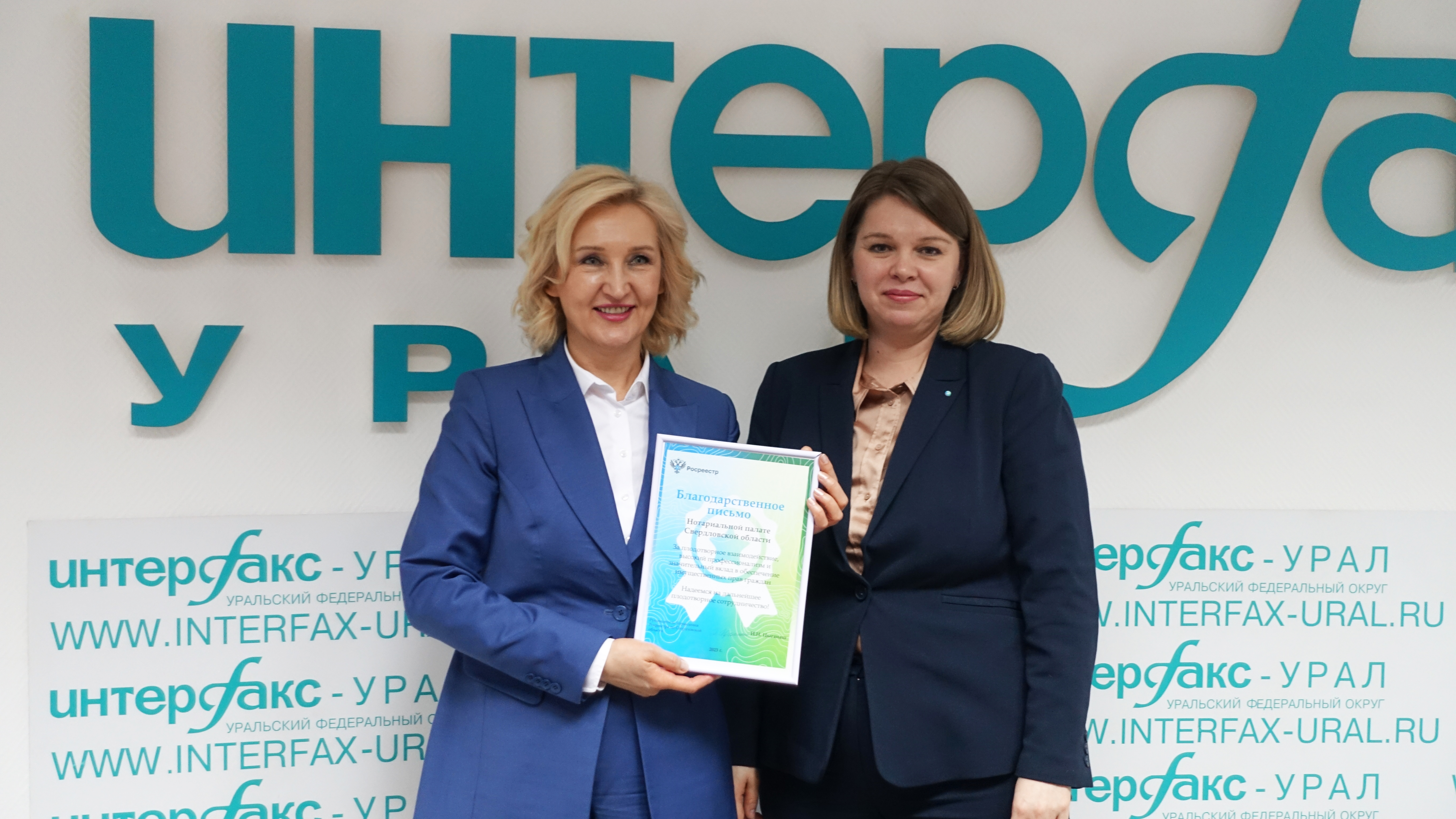 В завершение Ирина Семкина вручила Ирине Переваловой благодарственное письмо, в котором Управление Росреестра по Свердловской области благодарит Нотариальную палату Свердловской области за плодотворное взаимодействие, высокий профессионализм и значительный вклад в обеспечение имущественных прав граждан.