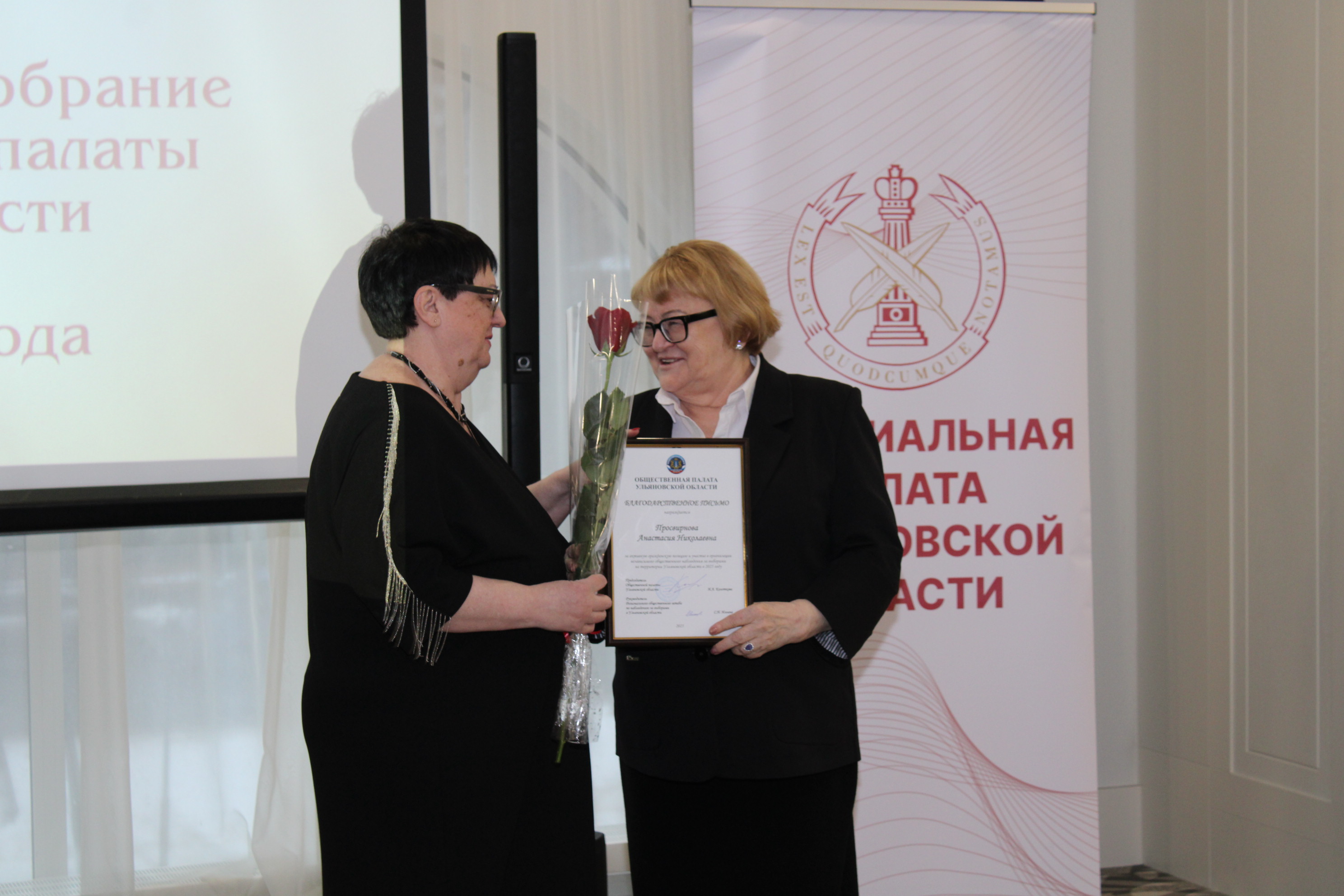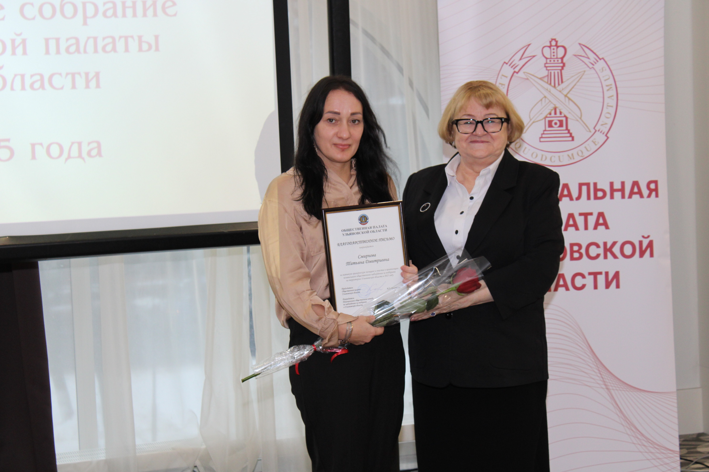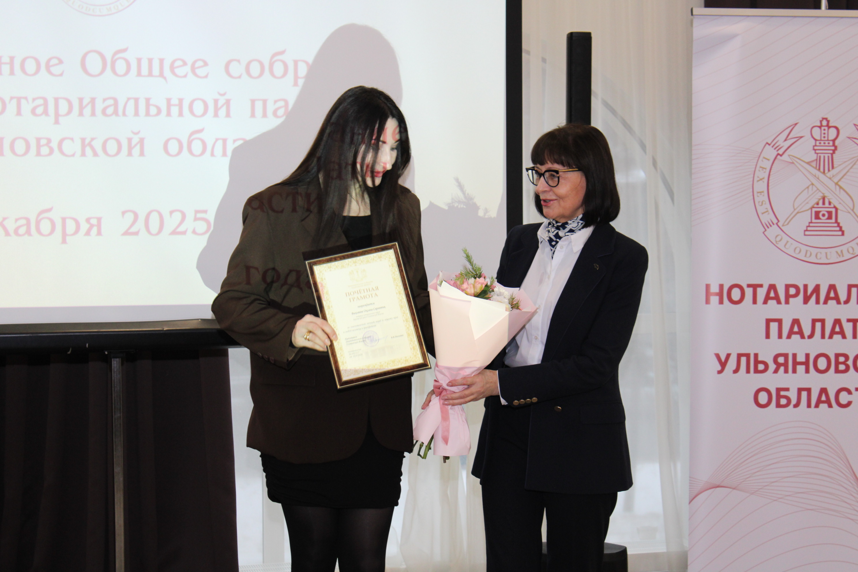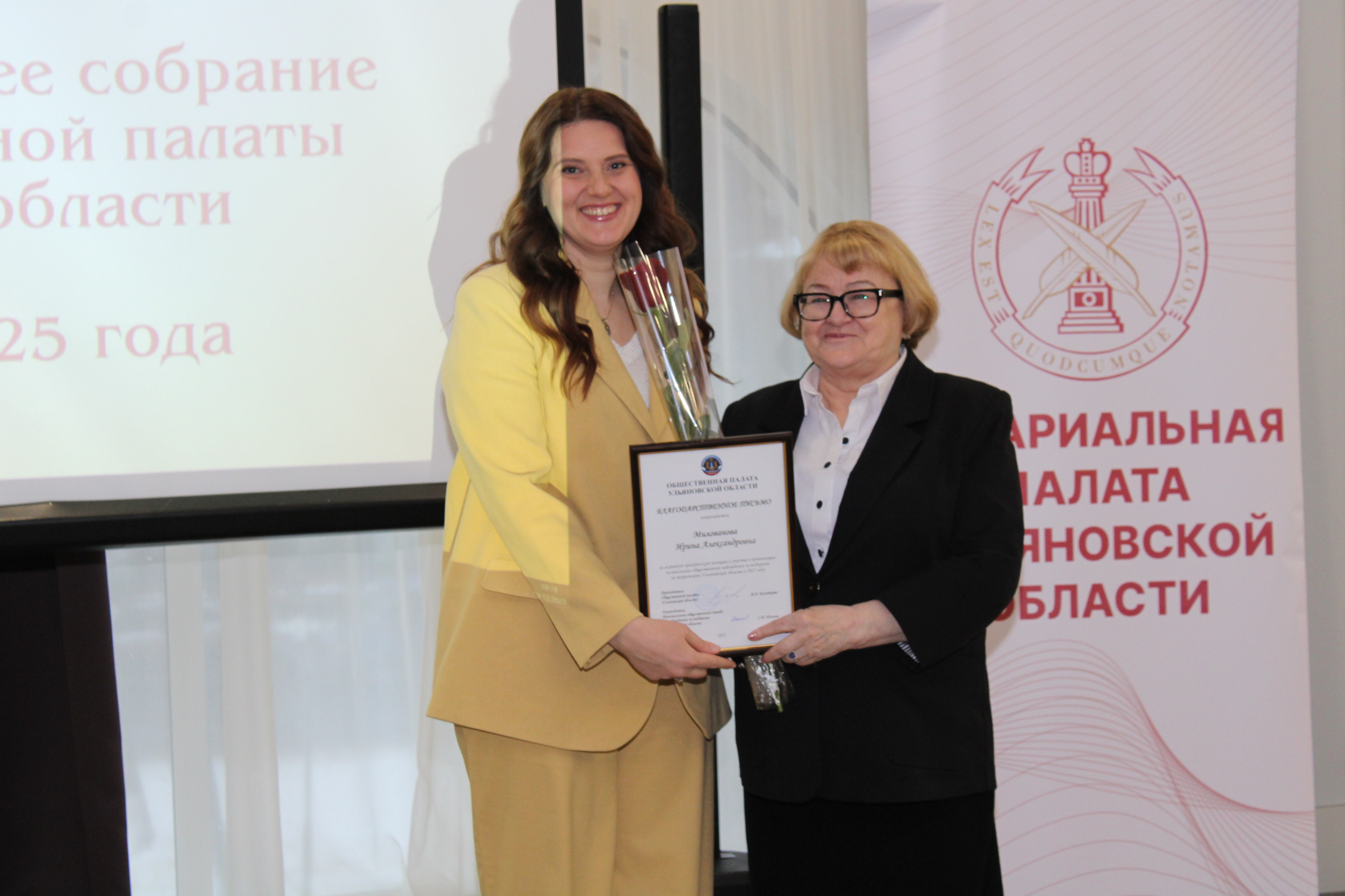 Кроме того, ряд представителей нотариального сообщества был отмечен наградами Общественной палаты Ульяновской области. Благодарственные письма вручила президент Нотариальной палаты Ульяновской области Венеря Браташова. Награды получили нотариус Ульяновского района Николай Алимбеков, нотариус Чердаклинского района Татьяна Смирнова, а также помощники нотариусов Юлия Железнова, Дмитрий Меденцев, Ирина Милованова, Анастасия Просвирнова и Софья Чумнова.