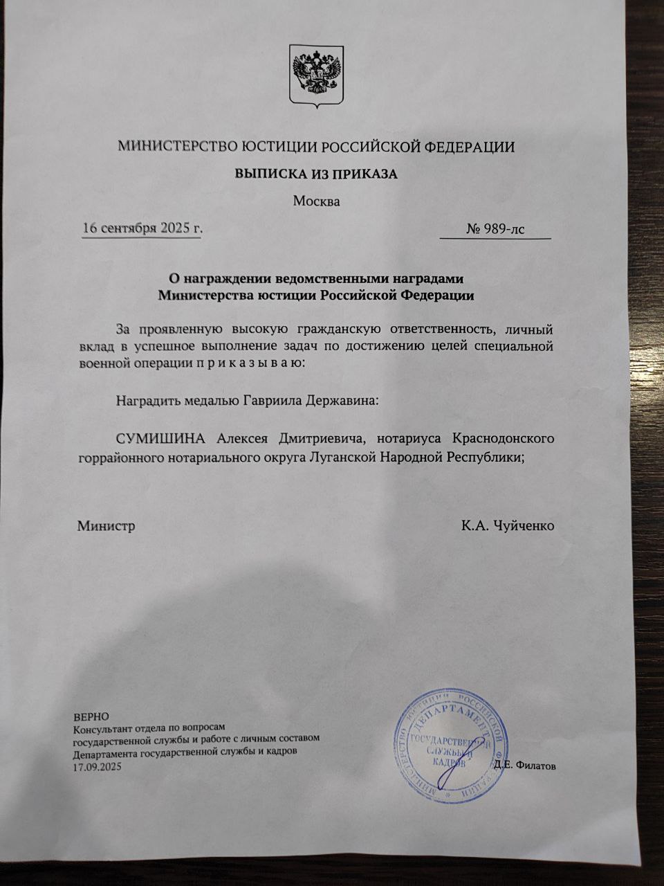 25 сентября нотариус города Краснодона Луганской Народной Республики Алексей Сумишин удостоен медали Гавриила Державина — ведомственной награды Министерства юстиции РФ.