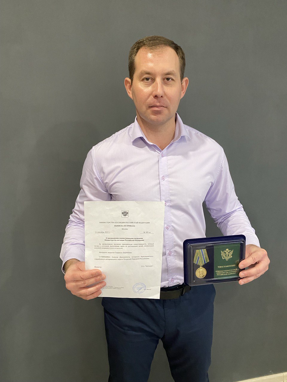 Награда вручена вместе с сопроводительным удостоверением Минюста РФ. Алексей Сумишин ранее принимал участие в боевых действиях, и вручение медали стало признанием его гражданской позиции и служения обществу наряду с профессиональной нотариальной деятельностью.