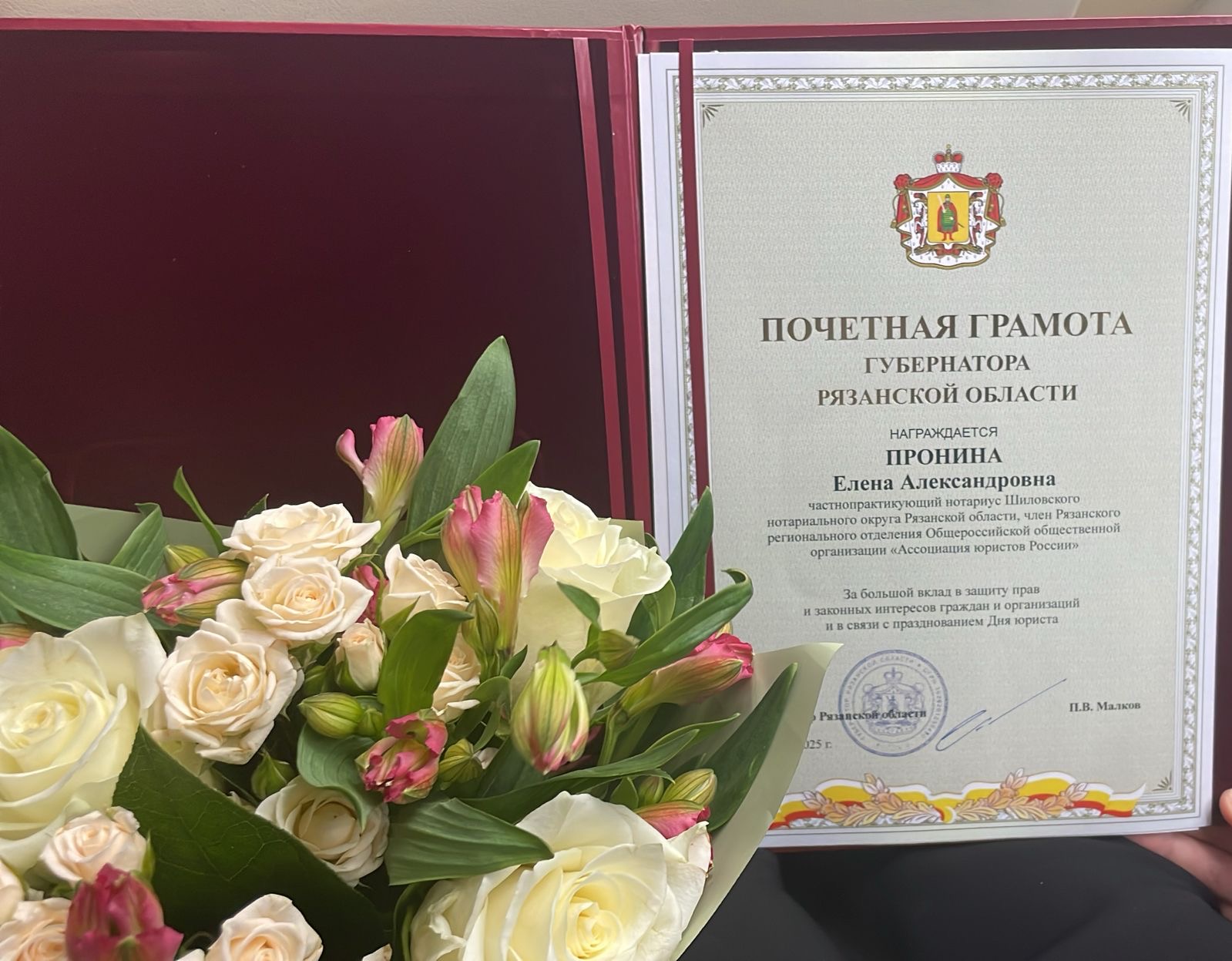 Благодарностью губернатора Рязанской области за многолетний плодотворный труд, сотрудничество в сфере оказания бесплатной юридической помощи, правовое просвещение и повышение правовой культуры населения награждены нотариус города Рязани Валерий Одиноков, нотариус Шиловского района Елена Пронина.