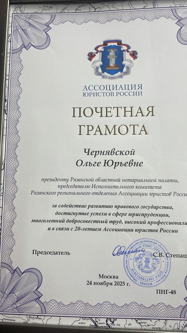 Звания «Почетный юрист Рязанской области» удостоена нотариус города Рязани Анна Симкина. Почетной грамотой Ассоциации юристов России награждена президент Рязанской областной нотариальной палаты Ольга Чернявская. Лауреатом премии «Юрист года» стала нотариус города Рязани Юлия Клочкова.
