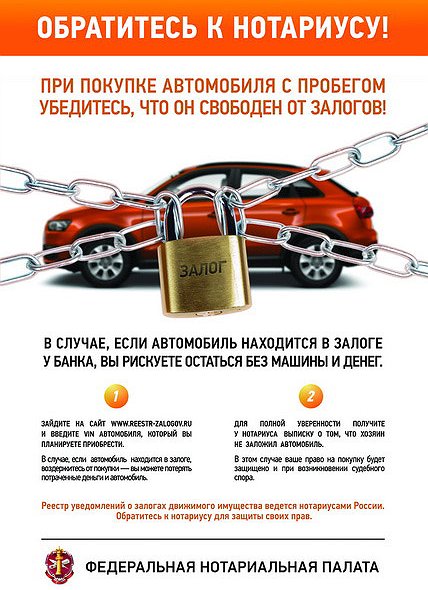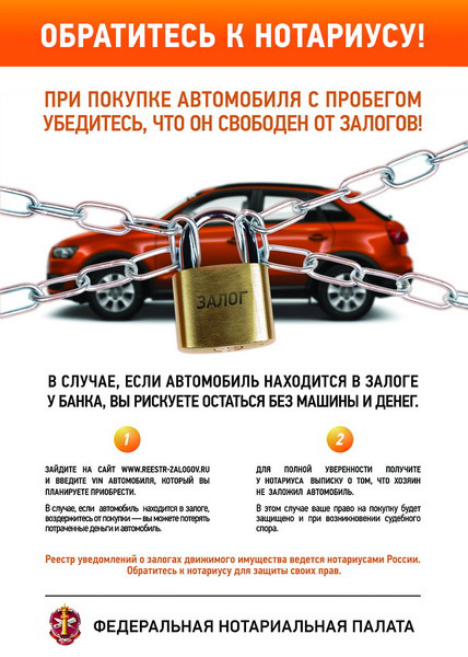 На прошедшем заседании Правления Федеральной нотариальной палаты Фонд развития правовой культуры представил вниманию членов Правления средство наглядной агитации из серии «Обратитесь к нотариусу!» для пропаганды новых нотариальных действий. Это плакат, посвящённый реестру уведомлений о залогах движимого имущества. Он призывает граждан прежде, чем купить автомобиль с пробегом, убедиться, что он свободен от залогов.