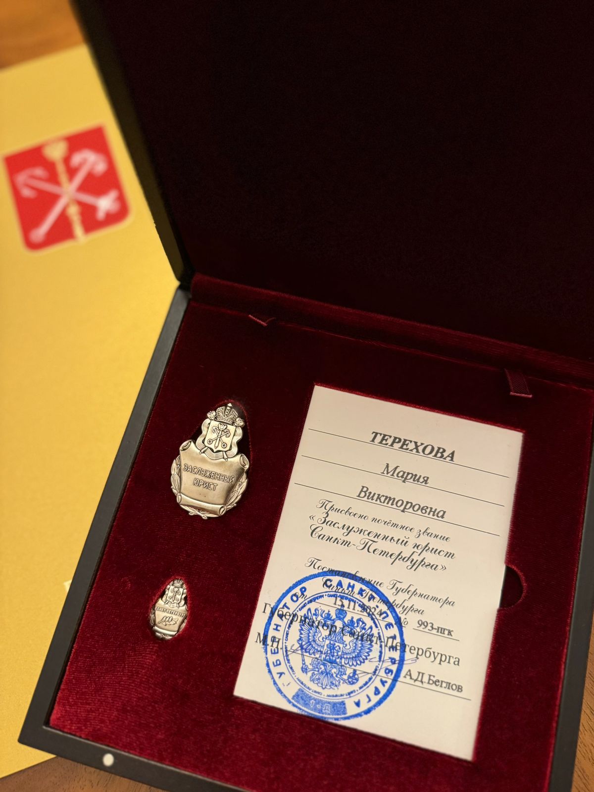 Главе петербургского нотариата присвоено почетное звание «Заслуженный юрист Санкт-Петербурга». Награду Марии Тереховой вручил губернатор Александр Беглов.
