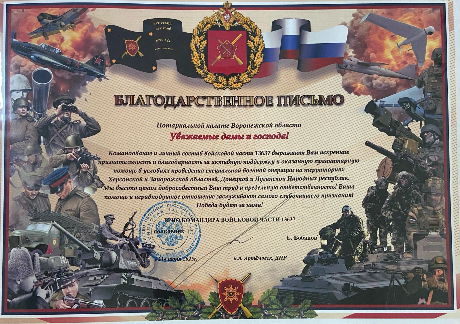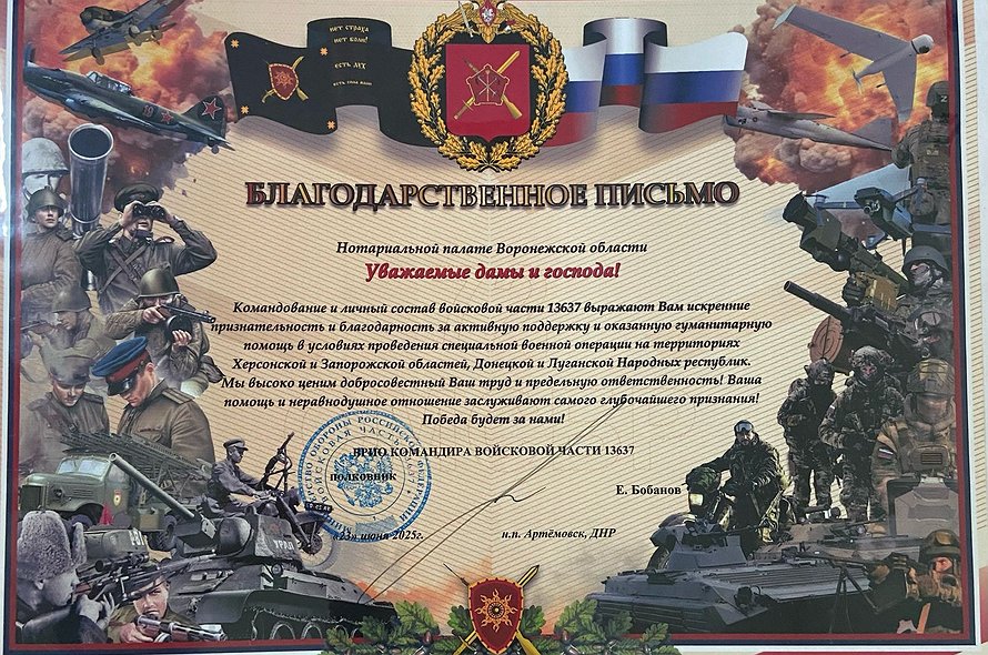 Президент Нотариальной палаты Воронежской области Анна Чугунова подчеркнула значимость таких инициатив: «Для нас важно не просто говорить о патриотизме, а действовать. Каждый наш взнос, каждая акция – это вклад в общее дело. Мы понимаем, что помощь военным – это не разовая акция, а постоянная работа. Наш долг – поддерживать тех, кто сегодня на передовой рискует жизнью ради безопасности страны. И мы будем продолжать эту работу, потому что сила России – в единстве ее народа».