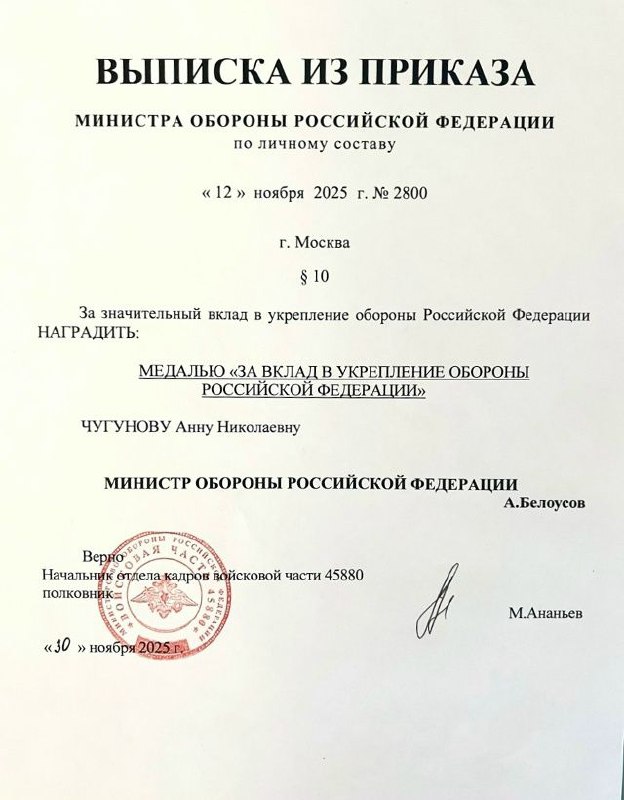 Президент Нотариальной палаты Воронежской области Анна Чугунова приказом Министра обороны Российской Федерации Андрея Белоусова награждена медалью «За вклад в укрепление обороны Российской Федерации». Почётная награда вручается гражданам и организациям за значительные заслуги в содействии решению задач, возложенных на Министерство обороны.
