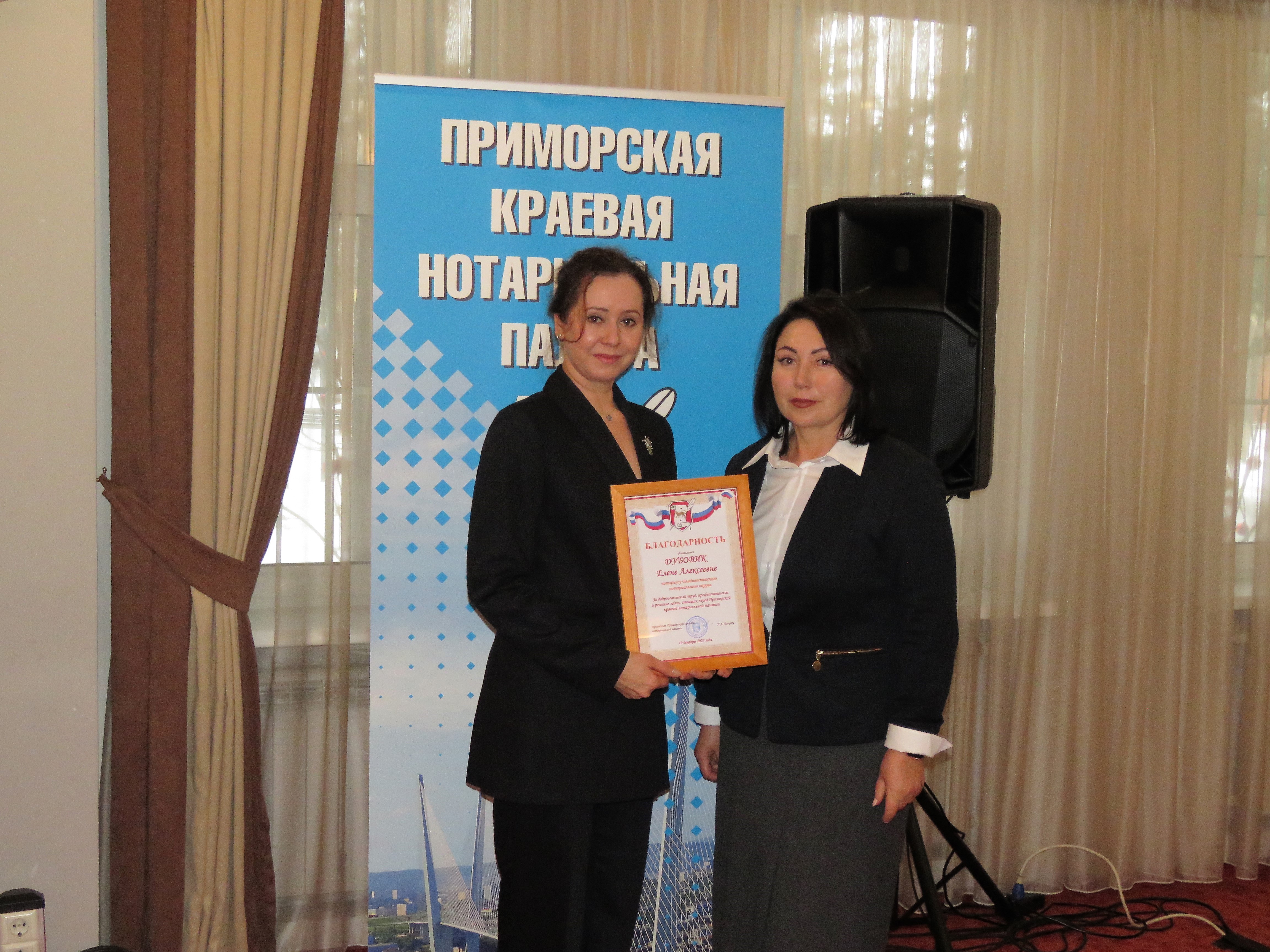 С приветственным словом к нотариальному сообществу обратилась заместитель начальника Главного управления Министерства юстиции РФ по Приморскому краю Елена Погорелова. Она отметила конструктивные рабочие отношения, сложившиеся с нотариальной палатой.