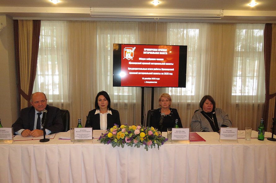 Наталья Егорова выступила с информацией о работе Приморской краевой нотариальной палаты за 2025 год. Нотариусы Приморского края утвердили план работы палаты на 2026 год, количество стажеров нотариуса, рассмотрели вопросы финансовой деятельности палаты.