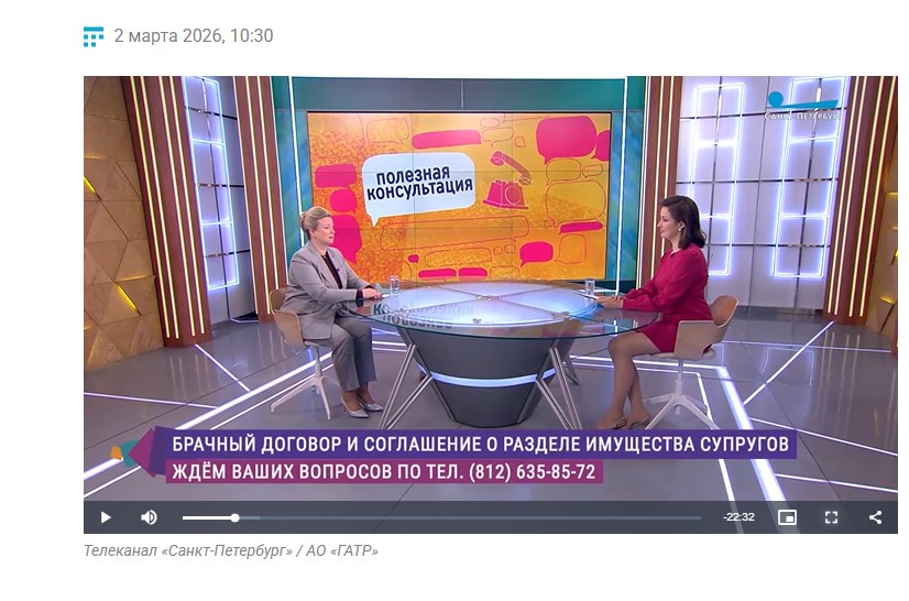 Вице-президент Нотариальной палаты Северной столицы Мария Терехова стала гостьей студии телеканала «Санкт-Петербург». В прямом эфире «Полезной консультации» она обсудила особенности брачного договора и соглашения о разделе имущества.