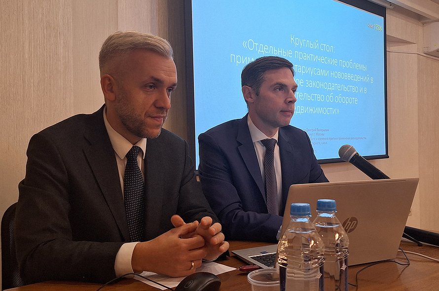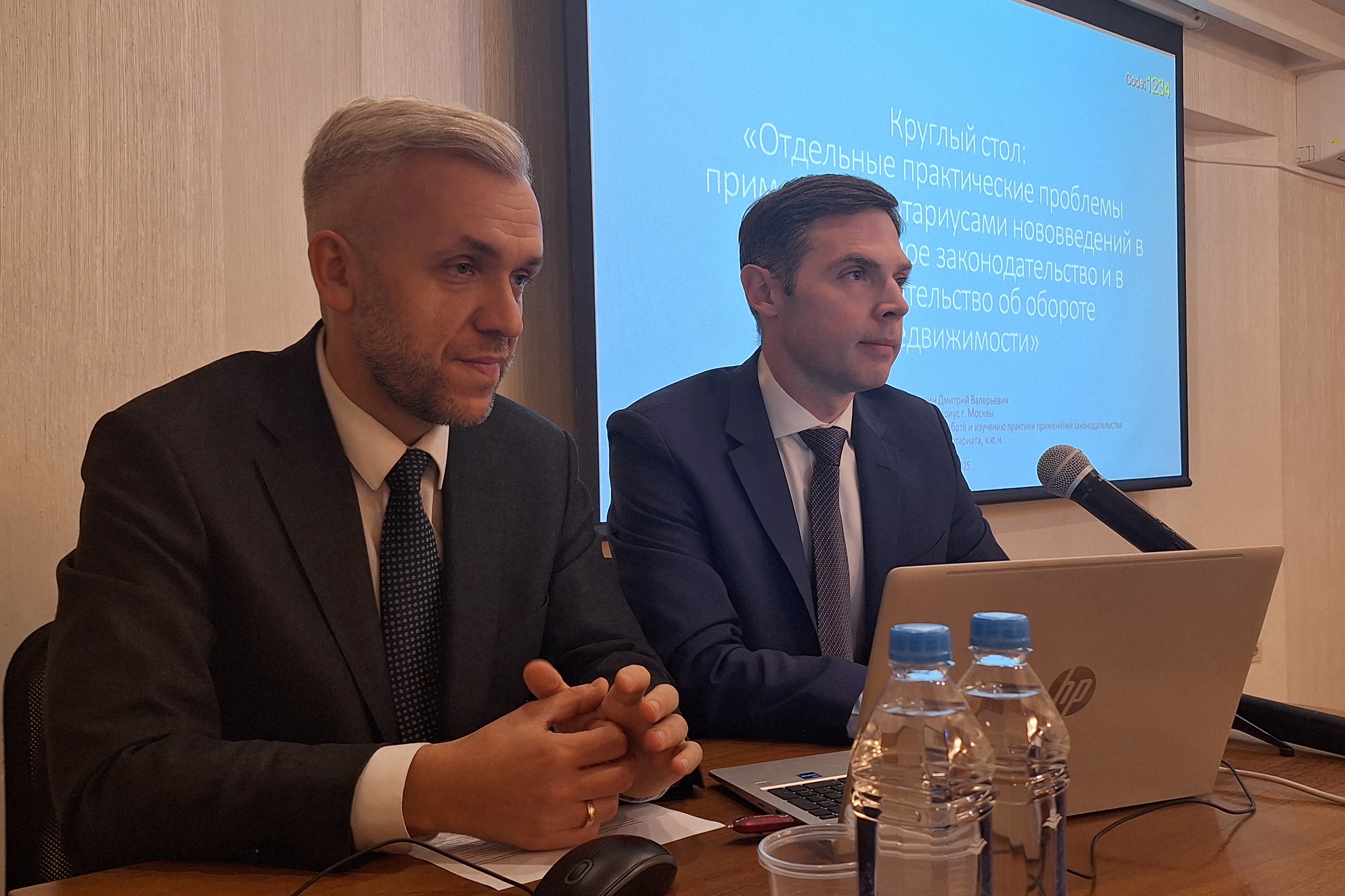 Спикерами круглого стола выступили нотариусы председатель Комиссии МГНП по методической работе и изучению практики применения законодательства в сфере нотариата Дмитрий Точкин и его заместитель Антон Макаров.
