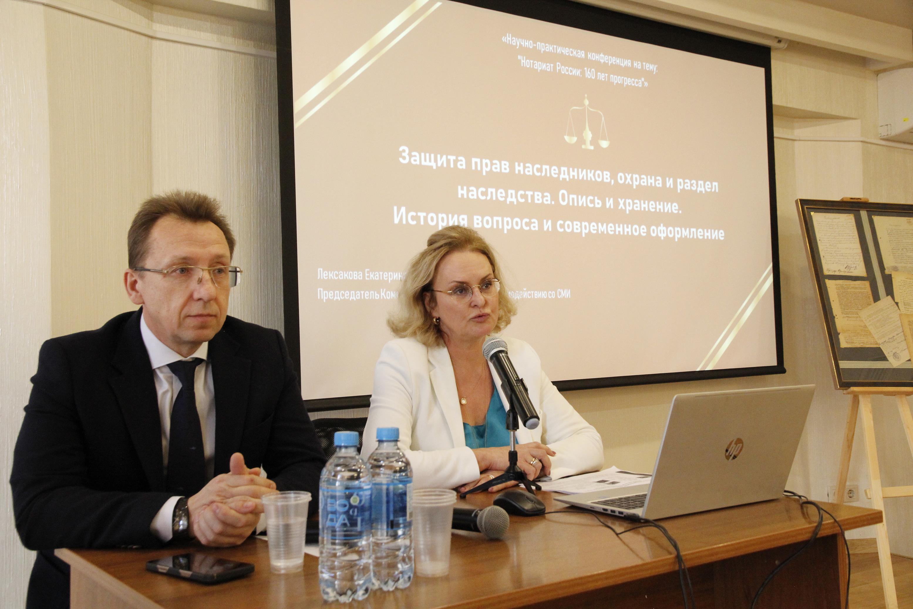 Вопросам защиты прав наследников, охраны и раздела наследства в XIX веке и на современном этапе посвятила свое выступление председатель комиссии МГНП по связям со СМИ и имиджу нотариус г. Москвы Екатерина Лексакова. В частности она проследила развитие института описи и хранения наследственного имущества в российском праве. Спикер также рассмотрела новеллы Положения о нотариальной части в отношении структурной организации нотариата, устоявшиеся нормы законодательства Российской Империи того времени в регулировании наследственных вопросов и роль, которая отводилась нотариусам при разделе наследства.