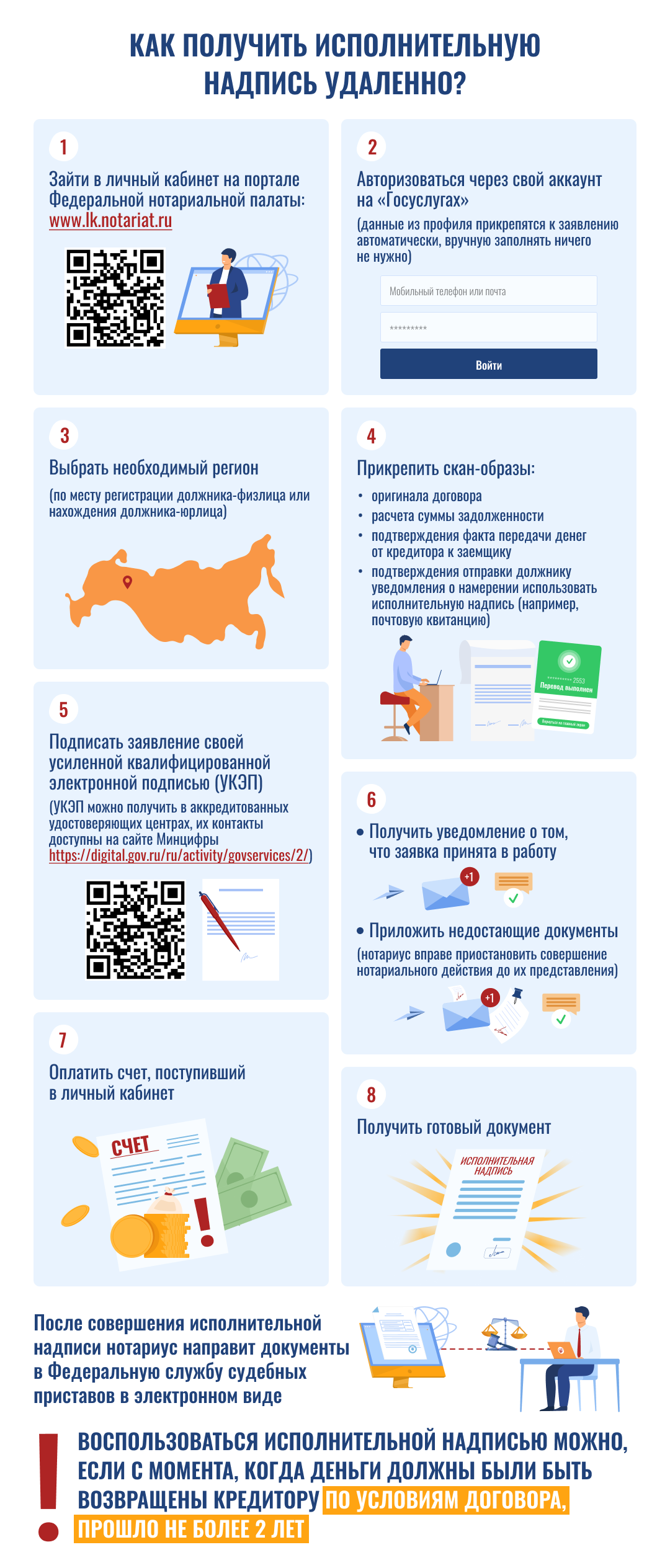 С 2021 года за совершением исполнительной надписи можно обратиться удаленно — через интернет-портал Федеральной нотариальной палаты. Эта услуга доступна в разделе «Удаленные нотариальные действия».